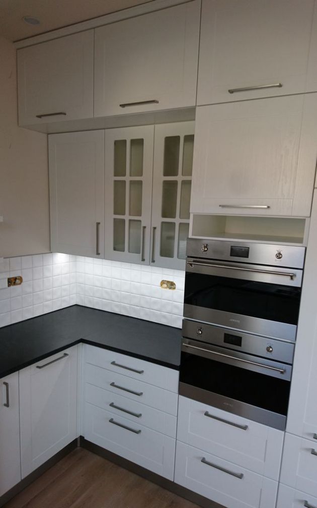 Luxusní linka v podkroví s žulovou pracovní deskou. Řešení do stropu nabízí velké množství úložných prostor a dokonale nahrazuje absenci klasických horních skříněk. Bílý obklad, police s osvětlením a volně stojící spotřebiče dávají lince moderní vzhled!