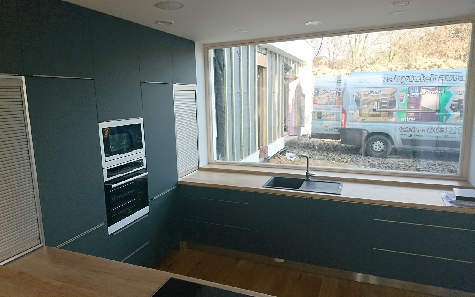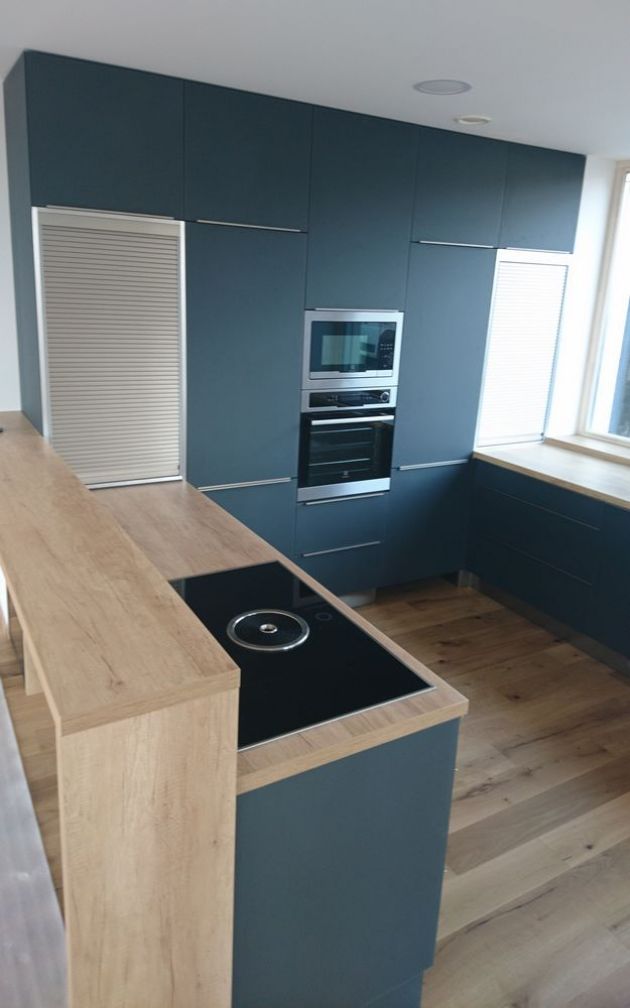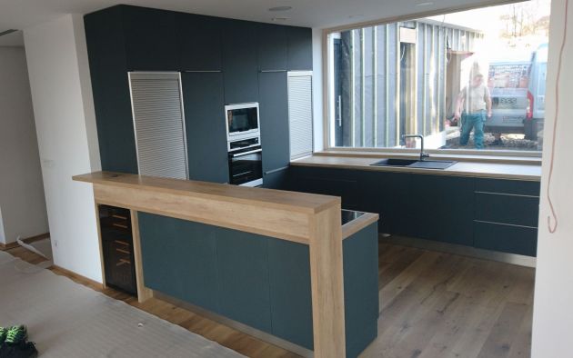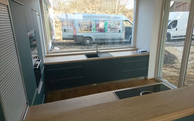 Luxusní linka v netradiční kombinaci mordo-šedé a přírodního dubu. Velké množství úložných prostor, ale i pracovní plochy. Výsuvné rolety jsou praktické, po designové stránce velice pohledné a spolu s barovým pultem dávají lince moderní vzhled.