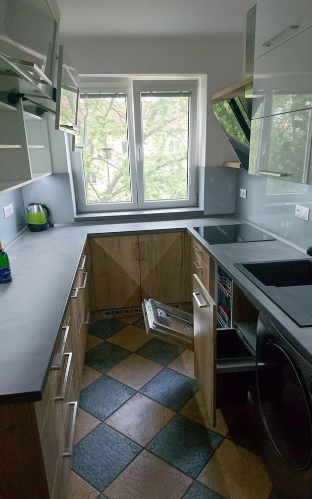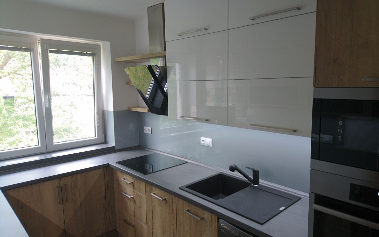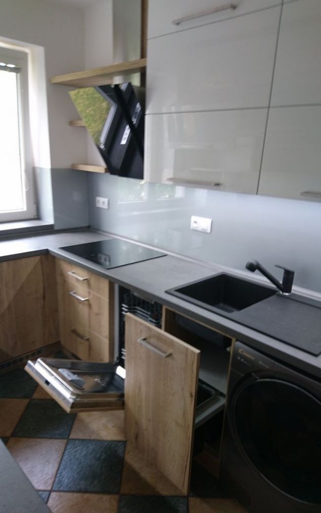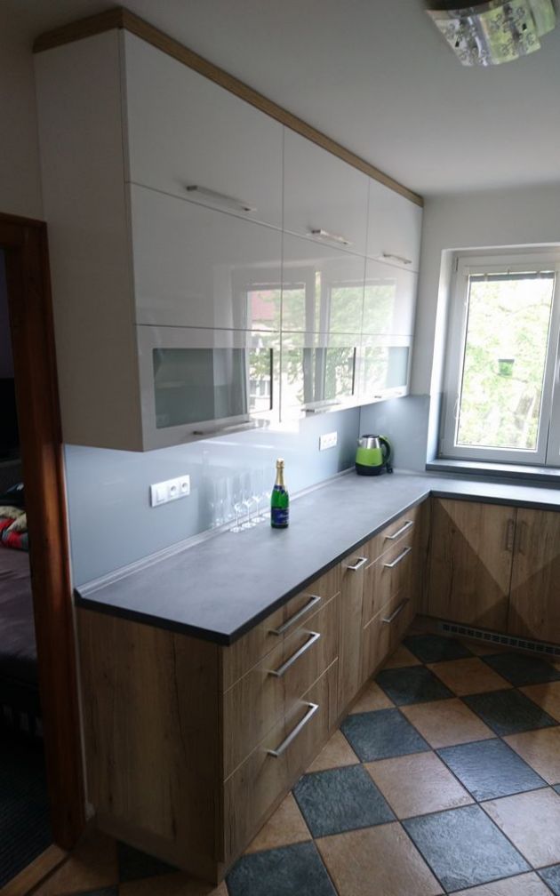 Moderní kuch. linka ve velice oblíbené kombinaci bílé lesklé, tmavého antracitu a přírodního dubu Halifax! Designové a praktické police spolu s řešením do stropu nabízejí velké množství úložných prostor. Navazující struktura dřeva mezi jednotlivými dvířky a skleněná zástěna už jen podtrhují luxusní nádech této linky!