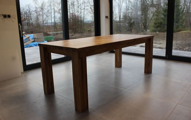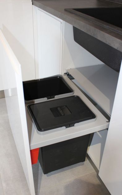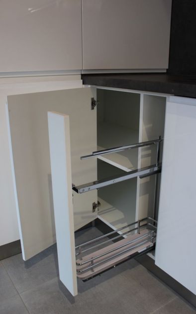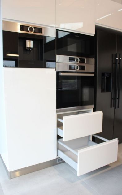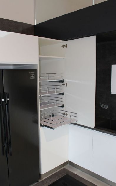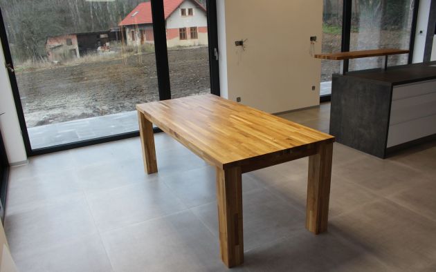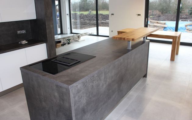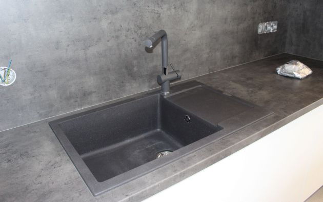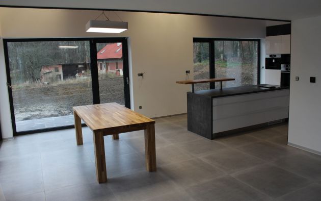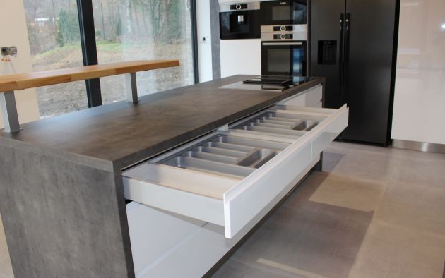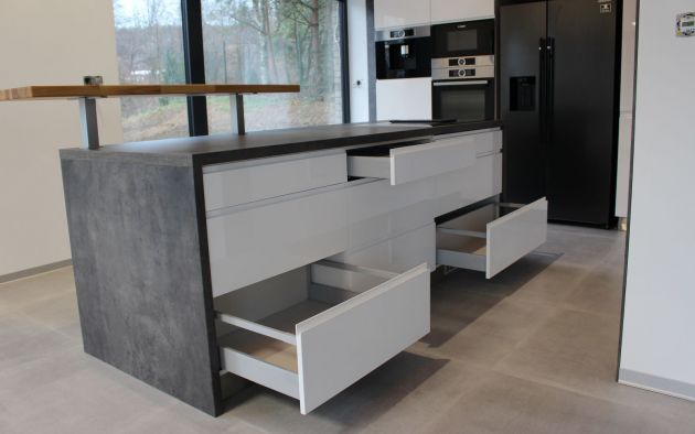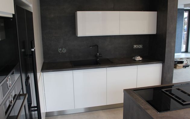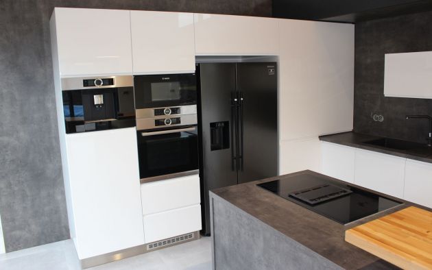Luxusní linka s lakovanými dvířky v bezúchytkovém provedení. Pracovní deska a obložení prostoru kolem linky ve velice oblíbeném dekoru tmavý beton. Barový pult a rozkládací stůl z dubové spárovky už jen podtrhují dokonalost této linky.