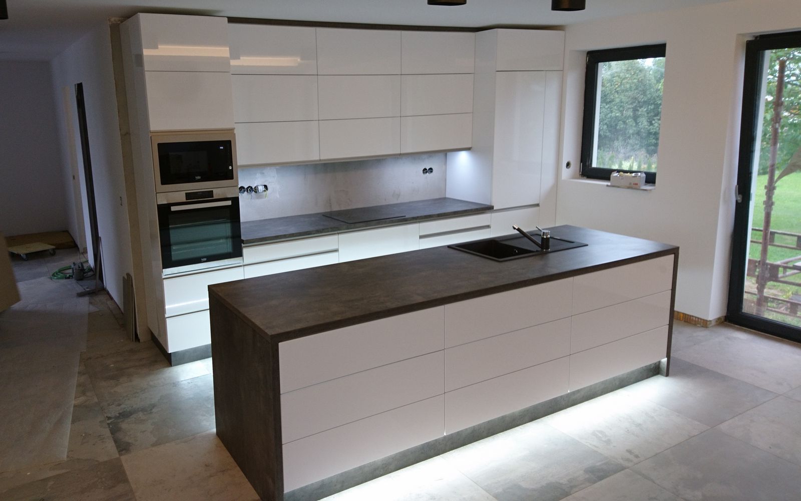Luxusní linka v oblíbené kombinaci bílého lesku a tmavého betonu s průchodem do spižírny v pravé části. Stropové řešení nabízí velké množství úložných prostor. Ostrůvek s výsuvy z obou stran spolu se spodním osvětlením celé linky vytvářejí moderní a zároveň luxusní nádech této linky.