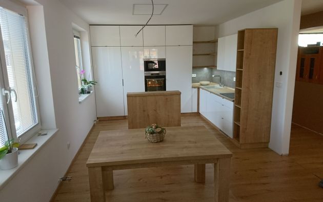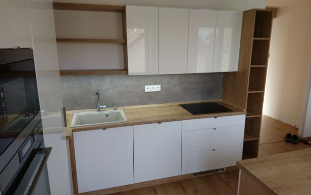 Moderní linka v oblíbené kombinaci bílého lesku a přírodního dubu. Praktický ostrůvek nabízí velkou pracovní plochu i úložné prostory. Otevřené police a stůl s nástavcem už jen podtrhují luxusní vzhled této linky!
