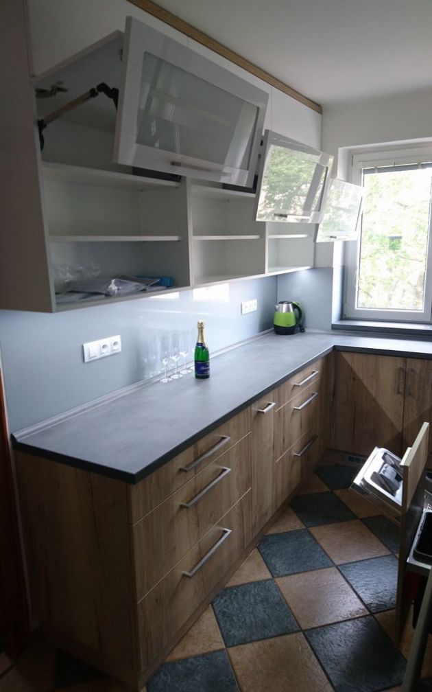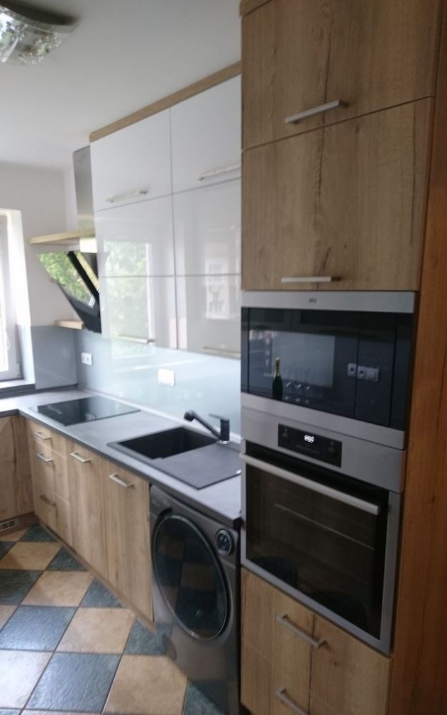 Moderní kuch. linka ve velice oblíbené kombinaci bílé lesklé, tmavého antracitu a přírodního dubu Halifax! Designové a praktické police spolu s řešením do stropu nabízejí velké množství úložných prostor. Navazující struktura dřeva mezi jednotlivými dvířky a skleněná zástěna už jen podtrhují luxusní nádech této linky!