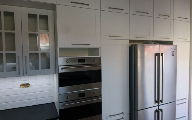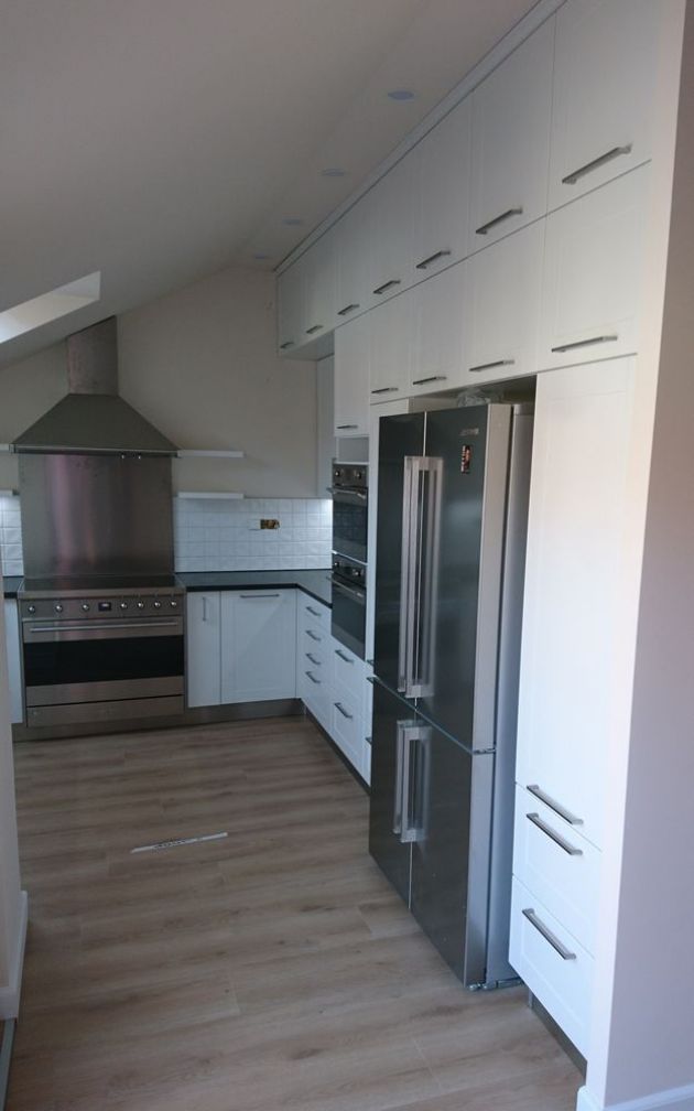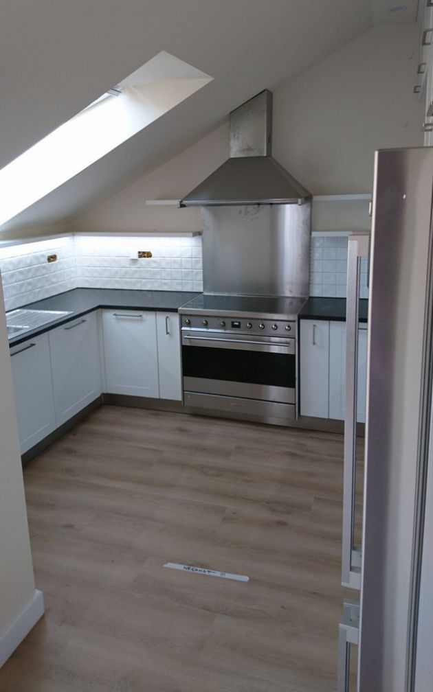 Luxusní linka v podkroví s žulovou pracovní deskou. Řešení do stropu nabízí velké množství úložných prostor a dokonale nahrazuje absenci klasických horních skříněk. Bílý obklad, police s osvětlením a volně stojící spotřebiče dávají lince moderní vzhled!