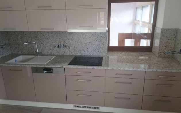Cappuccino-vanilková lesklá kuch. linka s žulovou pracovní deskou