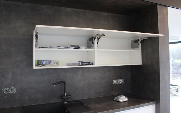 Luxusní linka s lakovanými dvířky v bezúchytkovém provedení. Pracovní deska a obložení prostoru kolem linky ve velice oblíbeném dekoru tmavý beton. Barový pult a rozkládací stůl z dubové spárovky už jen podtrhují dokonalost této linky.